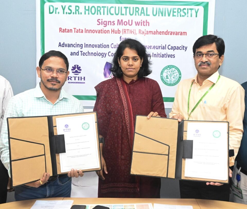 ఉద్యాన పంటల్లో సాంకేతిక పరిజ్ఞానం రైతులకు అందించే విధంగా చర్యలు చేపడుతున్నామని, అందులో భాగంగా హార్టికల్చర్ యూనివర్సిటీ తో అవగాహన ఒప్పందం కుదుర్చుకున్నట్లు జిల్లా కలెక్టర్, కీర్తి చేకూరి పేర్కొన్నారు. మంగళవారం తాడేపల్లిగూడెం మండలం, వెంకటరామన్న గూడెం గ్రామంలో ఉన్న డాక్టర్ వై ఎస్ ఆర్ హార్టీకల్చరల్ యూనివర్సిటీలో, రాజమహేంద్రవరం రూరల్, బొమ్మూరులో ఉన్న రతన్ టాటా ఇన్నోవేషన్ హబ్తో సంయుక్తంగా సాంకేతిక పరిజ్ఞానం అభివృద్ధి కోసం ఒక ముఖ్యమైన ఒప్పందం కుదుర్చుకునే కార్యక్రమంలో జిల్లా కలెక్టర్ పాల్గొన్నారు.