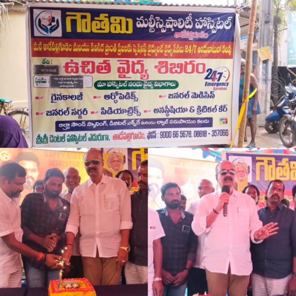 అతి తక్కువ ఖర్చుతో మల్టీ స్పెషాలిటీ వైద్యాన్ని తాడేపల్లిగూడెం ప్రజలకు అందిస్తున్న గౌతమి హాస్పిటల్ యాజమాన్యాన్ని అభినందించాలని ప్రభుత్వ విప్ బొలిశెట్టి శ్రీనివాసు తెలిపారు. పశ్చిమగోదావరి జిల్లా తాడేపల్లిగూడెం భాగ్యలక్ష్మి పేటలో కేంద్ర విమానయాన శాఖ మంత్రి కింజరపు రామ్మోహన్ నాయుడు పుట్టినరోజు వేడుకలు రాష్ట్ర టిడిపి ఆర్గనైజింగ్ సెక్రటరీ గొర్రెల శ్రీధర్ ఆధ్వర్యంలో అత్యంత ఘనంగా నిర్వహించారు. ఈ కార్యక్రమంలో ముఖ్యఅతిథిగా ప్రభుత్వ విప్పు బొలిశెట్టి శ్రీనివాస్ పాల్గొన్నారు. ఈ సందర్భంగా గౌతమి మల్టీ స్పెషాలిటీ సారధ్యంలో నిర్వహించిన మెగా మెడికల్ క్యాంపును ప్రారంభించారు. ఈ సందర్భంగా ఆయన మాట్లాడుతూ రాజకీయ నాయకులు, పార్టీ నాయకులు పుట్టినరోజులు, పెళ్లిరోజులను పేద ప్రజలకు ఉపయోగపడేలా కార్యక్రమాలు నిర్వహించాలని కోరారు. గొర్రెల శ్రీధర్ చేస్తున్న ప్రజా ఉపయోగ కార్యక్రమాలు అభినందించదగ్గ విషయమని కొనియాడారు. తాడేపల్లిగూడెంలో అత్యంత తక్కువ ఖర్చుతో ప్రజలకు మల్టీస్పెషలిటీ వైద్యాన్ని అందిస్తున్న గౌతమి హాస్పిటల్ యాజమాన్యాన్ని అభినందించారు. ఈ కార్యక్రమంలో గౌతమి హాస్పిటల్ మేనేజింగ్ డైరెక్టర్ డాక్టర్ రామకృష్ణ, మార్కెట్ యార్డ్ చైర్మన్ మంగాబాయ్ రమేష్, గౌతమి హాస్పిటల్ సిబ్బంది, నాయకులు పాల్గొన్నారు.